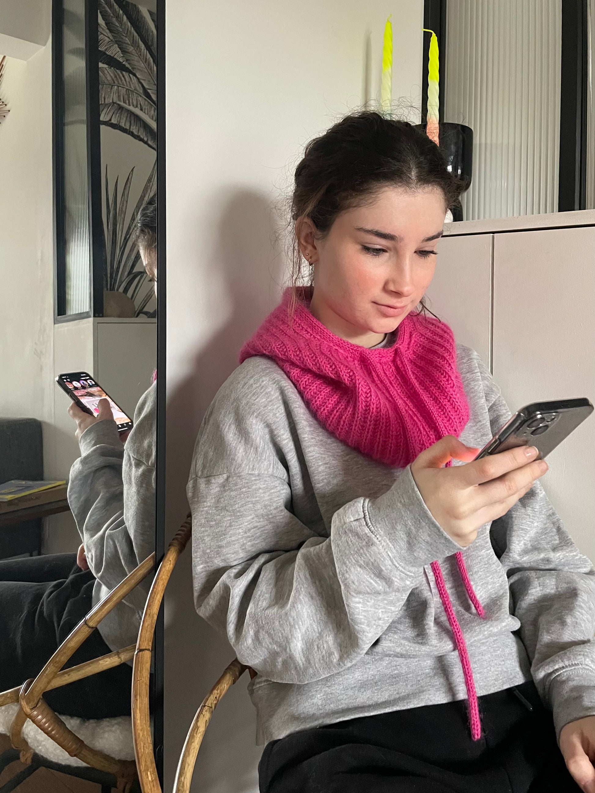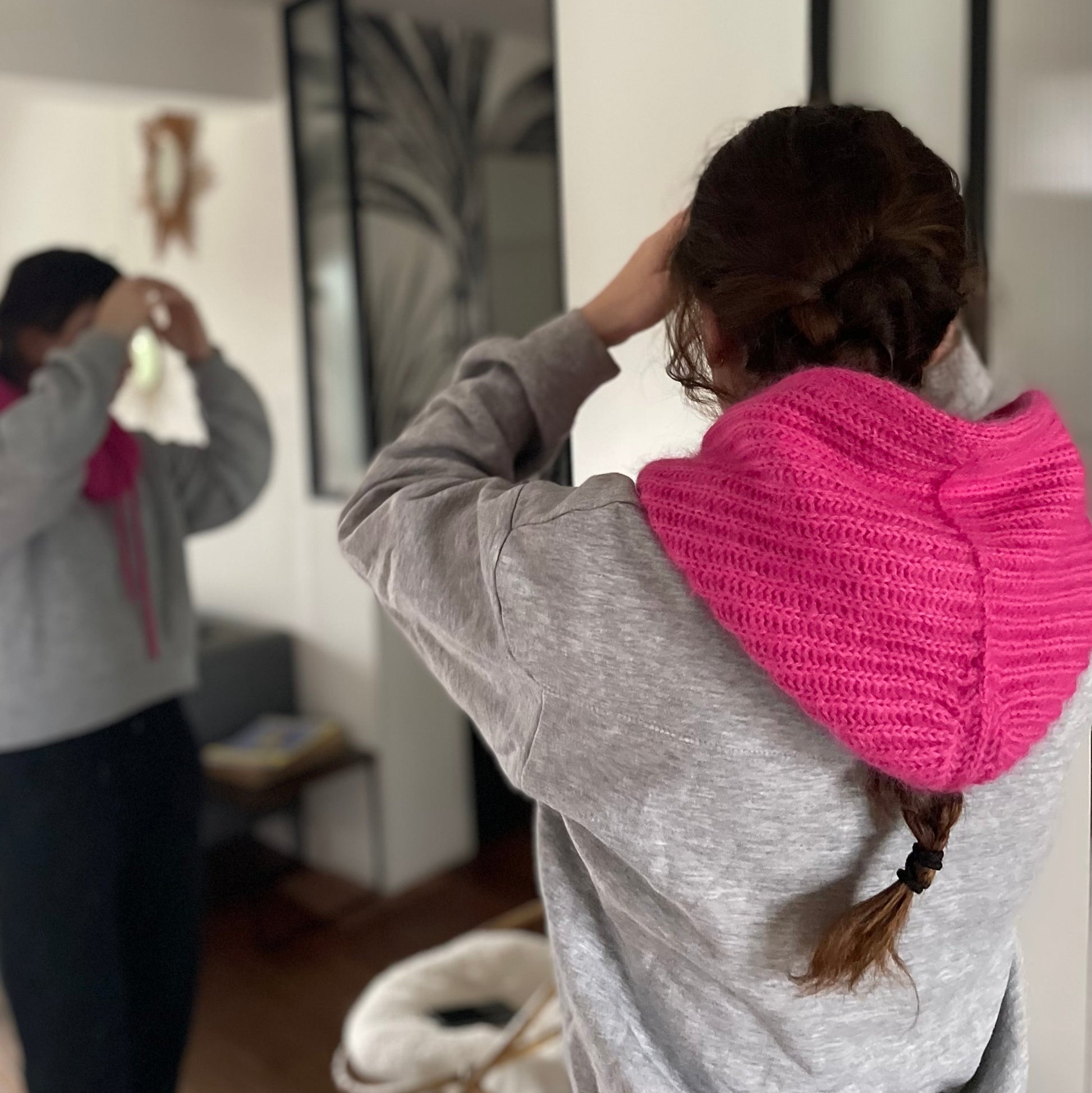 Capuche toute douce et moelleuse, point de brioche, double tricot et icord. À porter en version cagoule ou en capuche tour de cou!