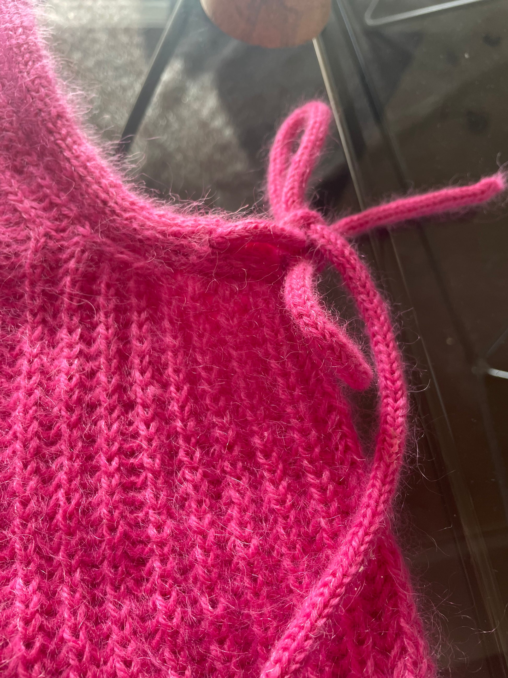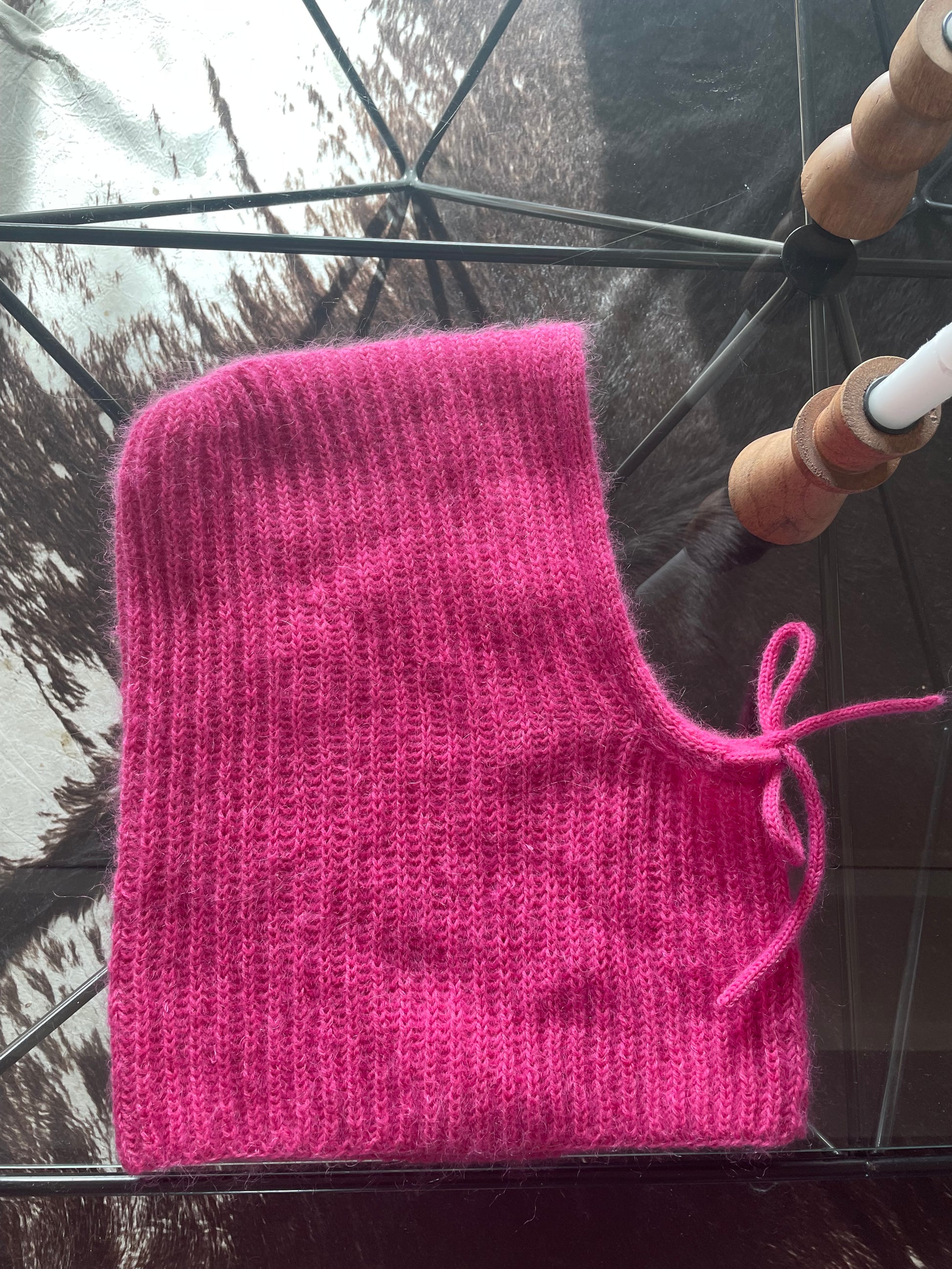 La capuche se tricote de bas en haut, d’abord en point brioche en rond, puis en allers-retours. Des diminutions forment un arrondi à l’arrière ( vous trouverez des explications différentes si vous êtes novice ou à l’aise avec le point brioche), le rabattage se fait avec des aiguilles double pointes et un crochet afin de maintenir la continuité visuelle de la maille centrale en V. Des mailles sont relevées tout autour et tricotées en double tricot pour former la coulisse. Le cordon est fait soit en icord, soit au tricotin.