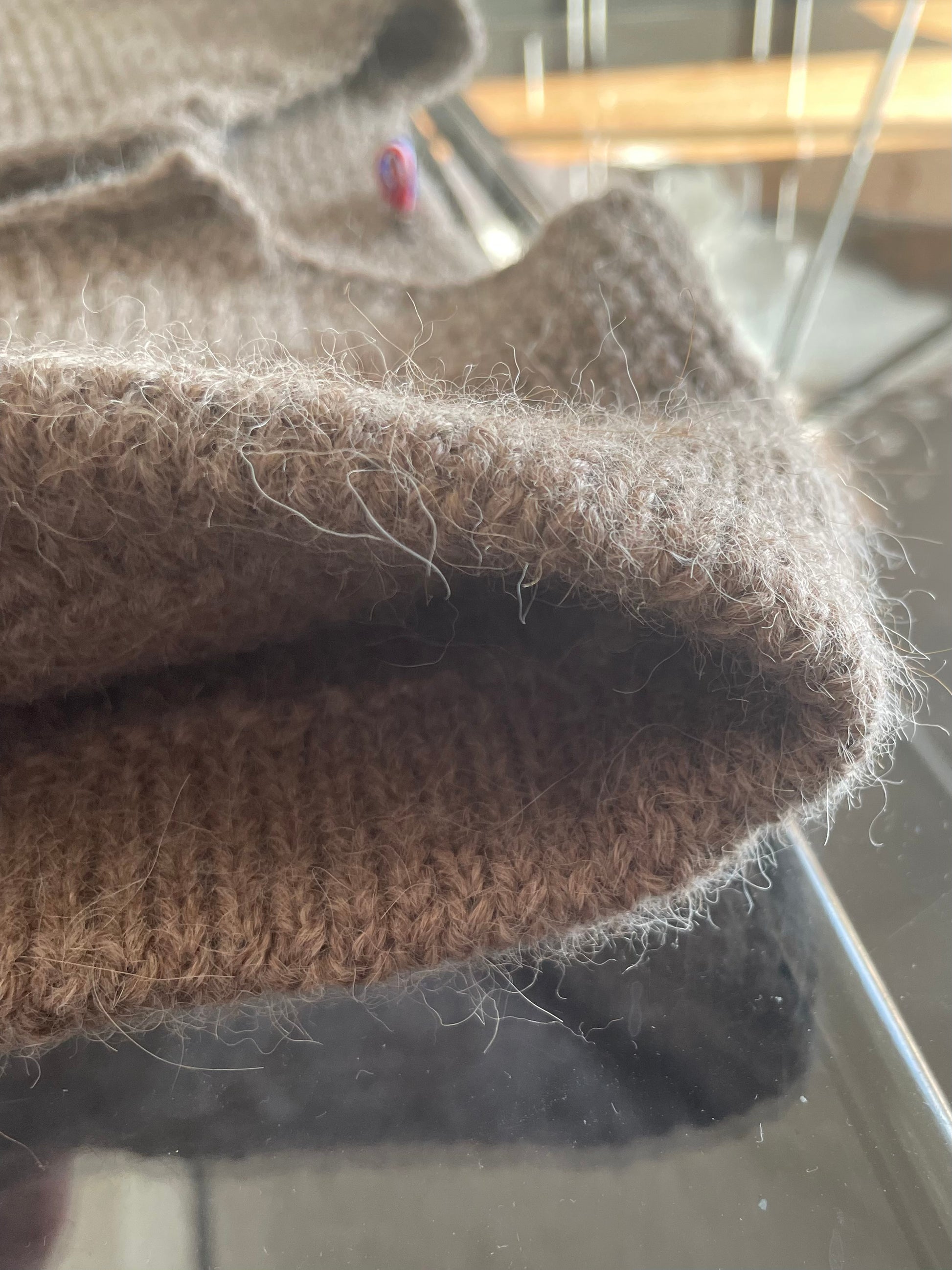 Échantillon: alpaga tricoté en double fil, en jersey aig.4, 10×10 cm = 21m. x 28 rangs.