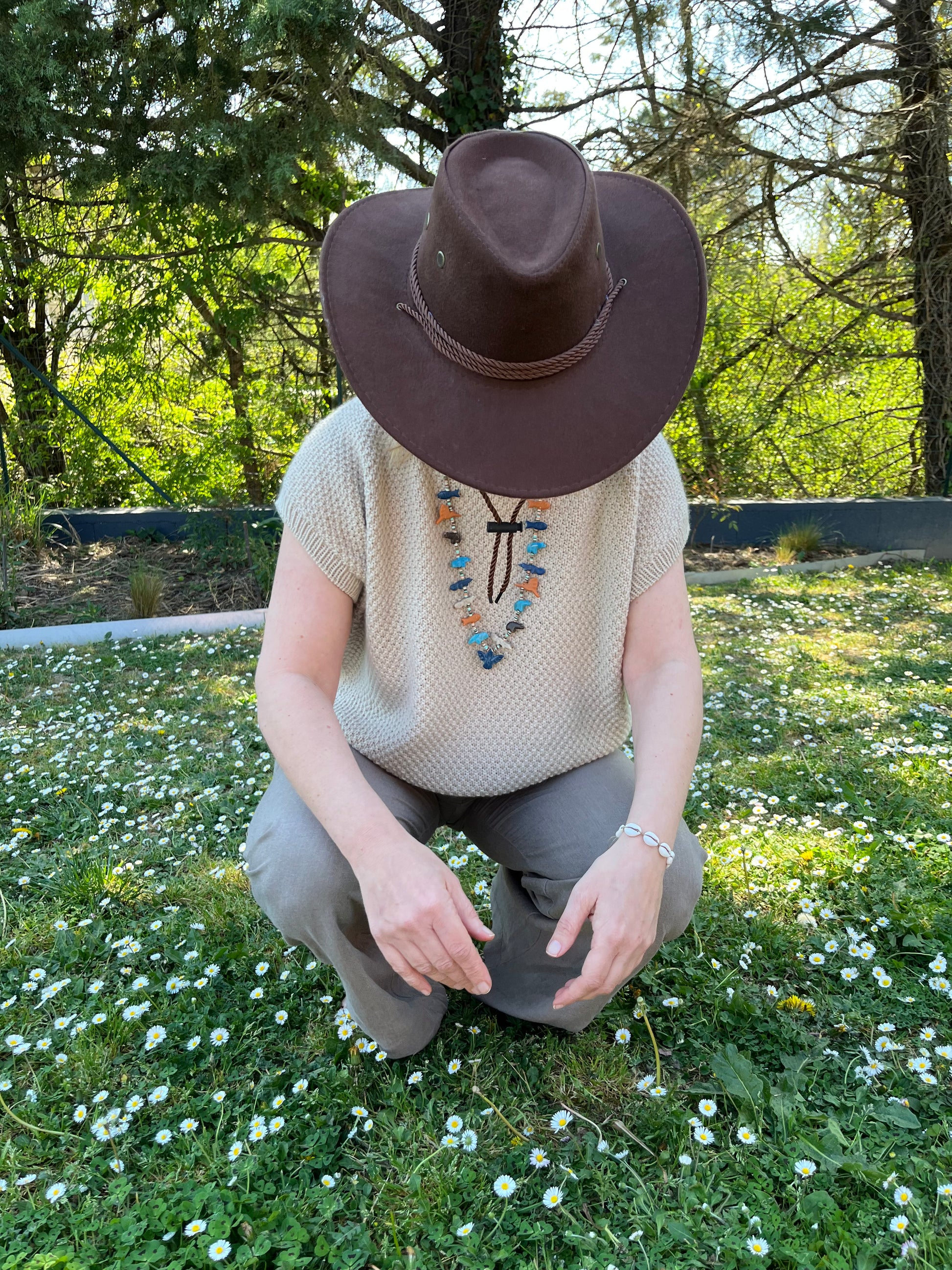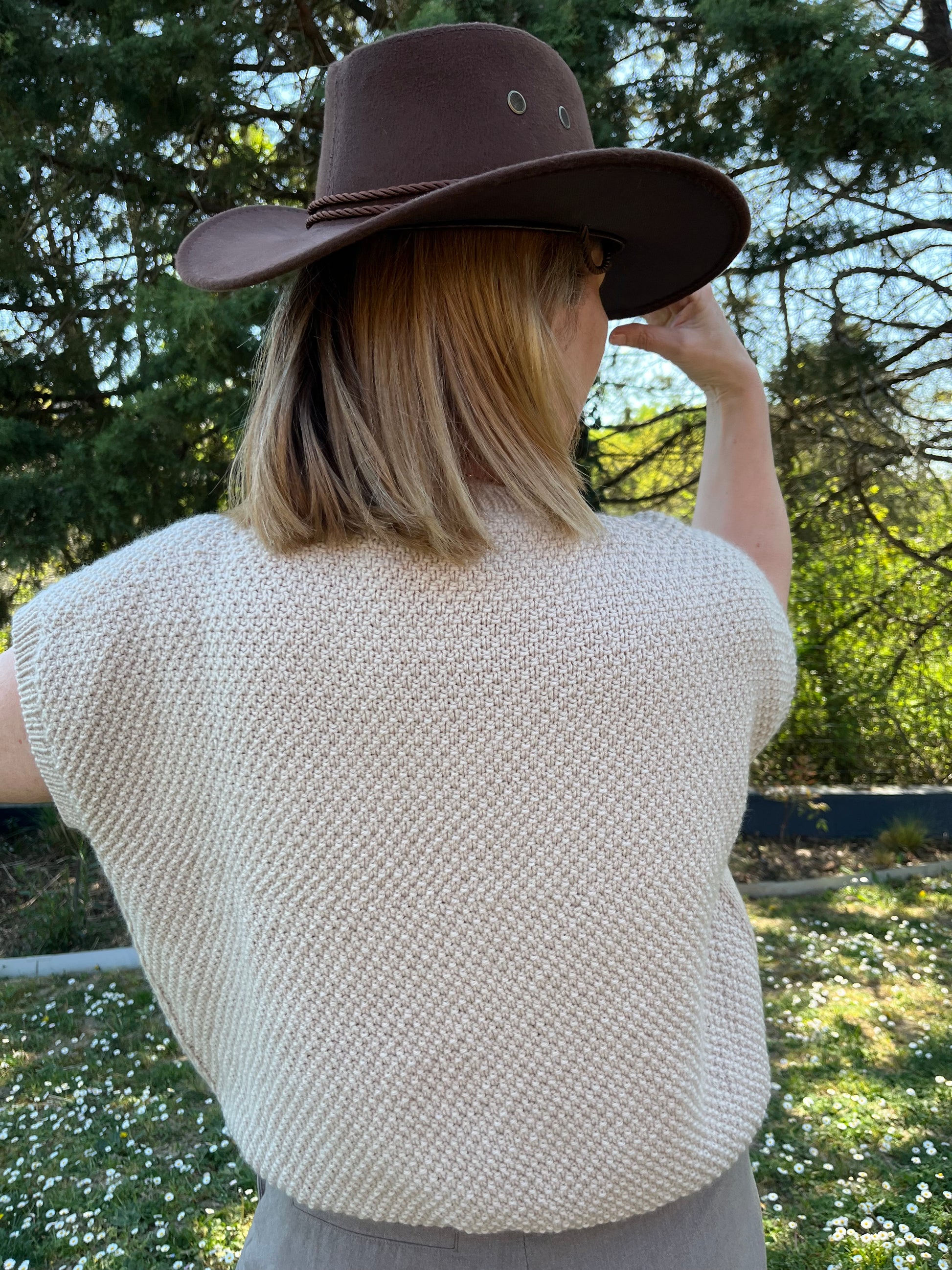 On commence par le dos en allers-retours et rangs raccourcis. Puis empiècement devant gauche puis droit. Le tout est joint sous les emmanchures et tricoté en rond. Puis relever les mailles pour les mancherons et le col en cotes 1×1. Les tricoter et réaliser les finitions.