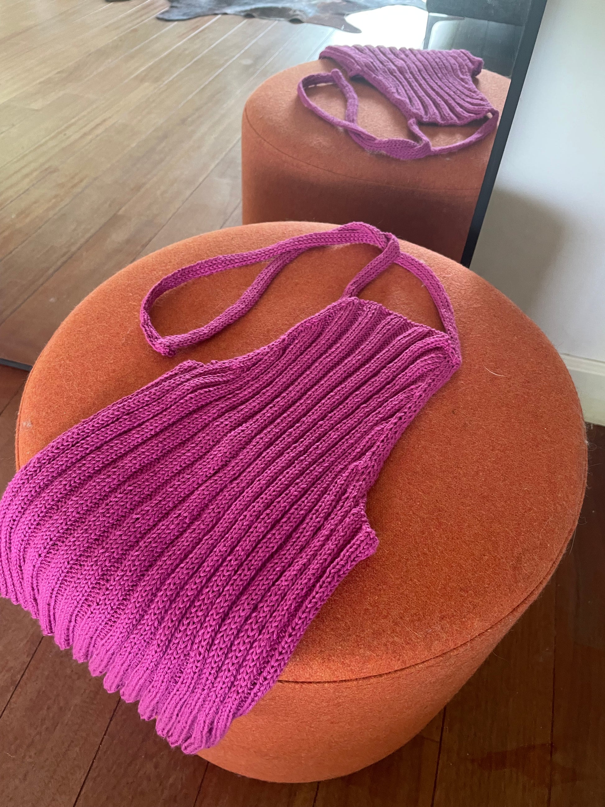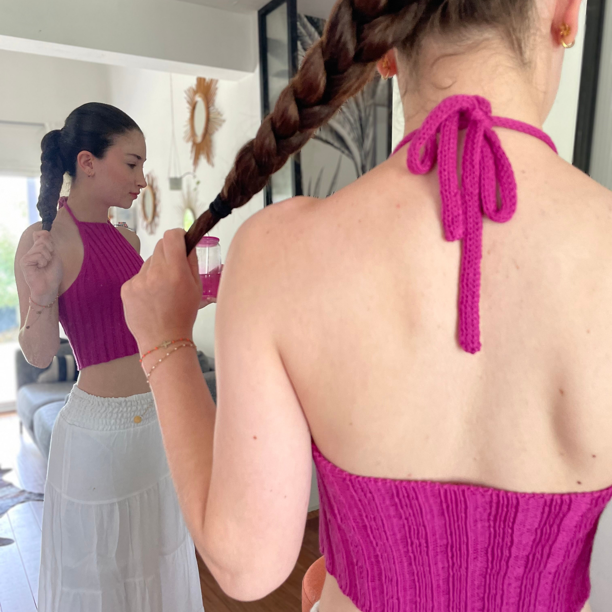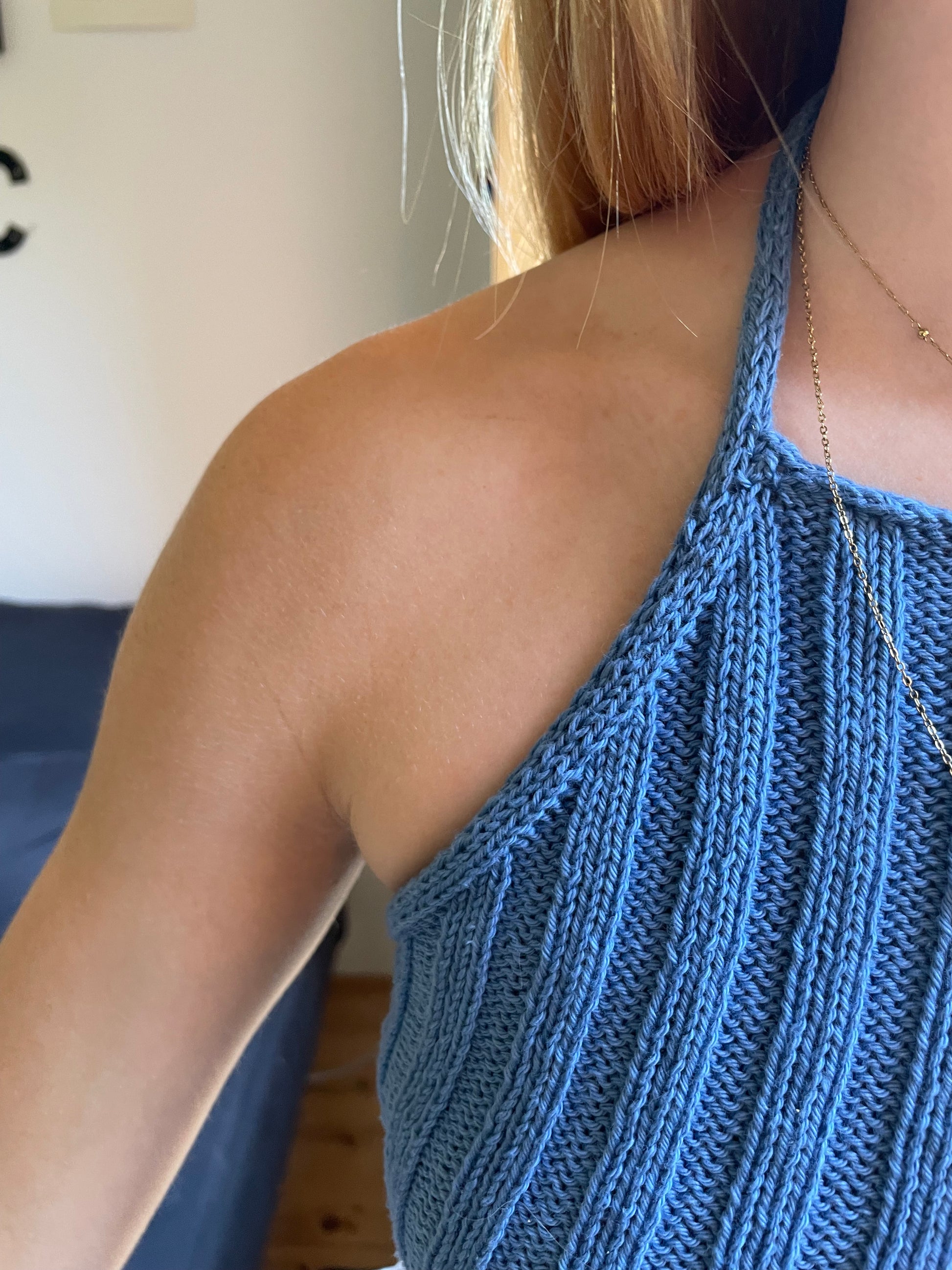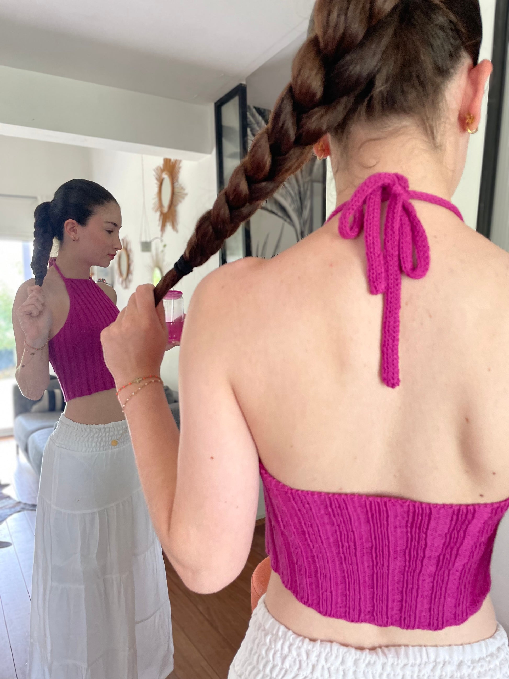 Les côtes 3×3 sont très extensibles. Vous pouvez jouer sur la longueur du top, sur les bretelles: classiques, croisées ou nouées autour du cou.